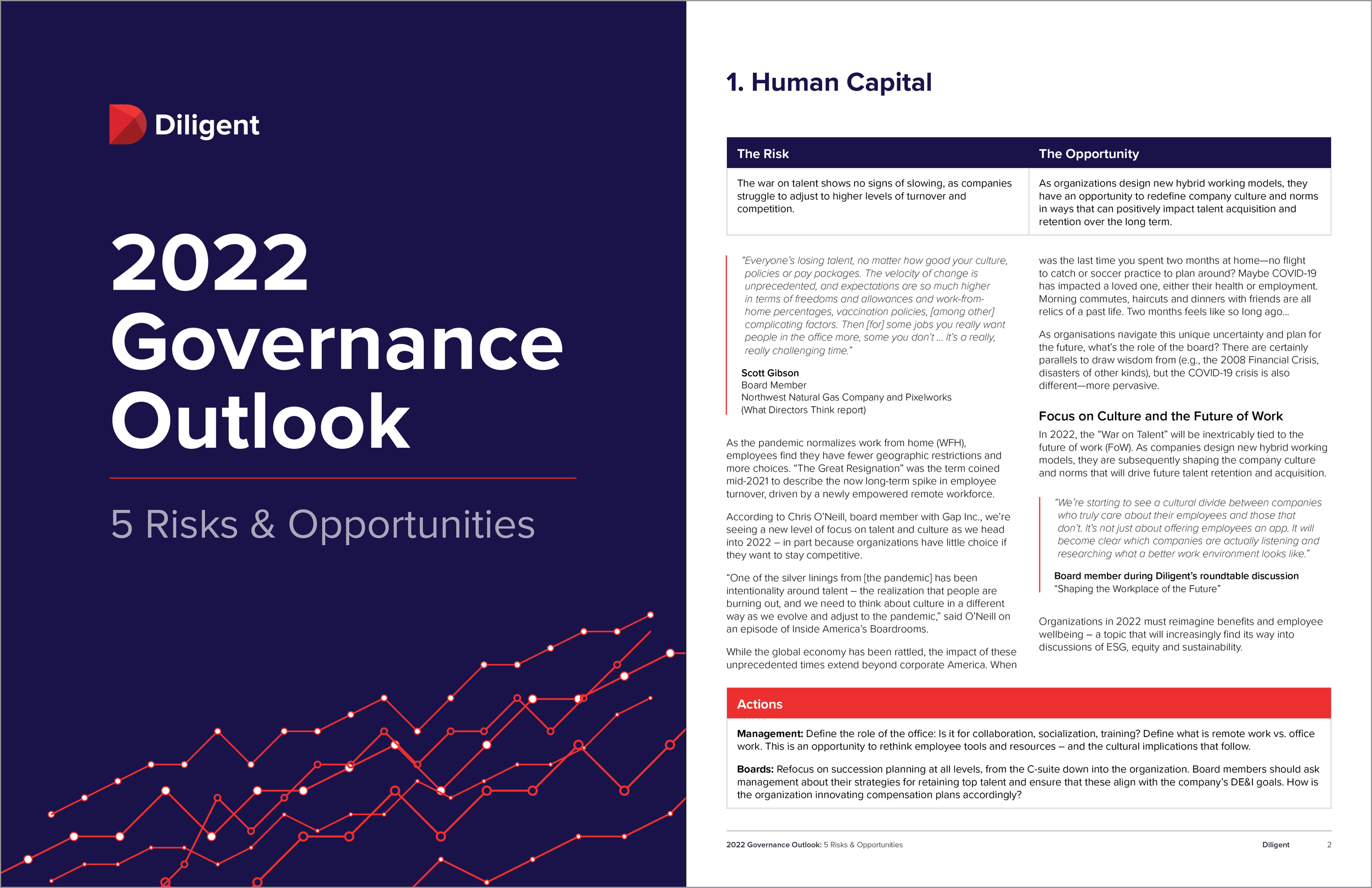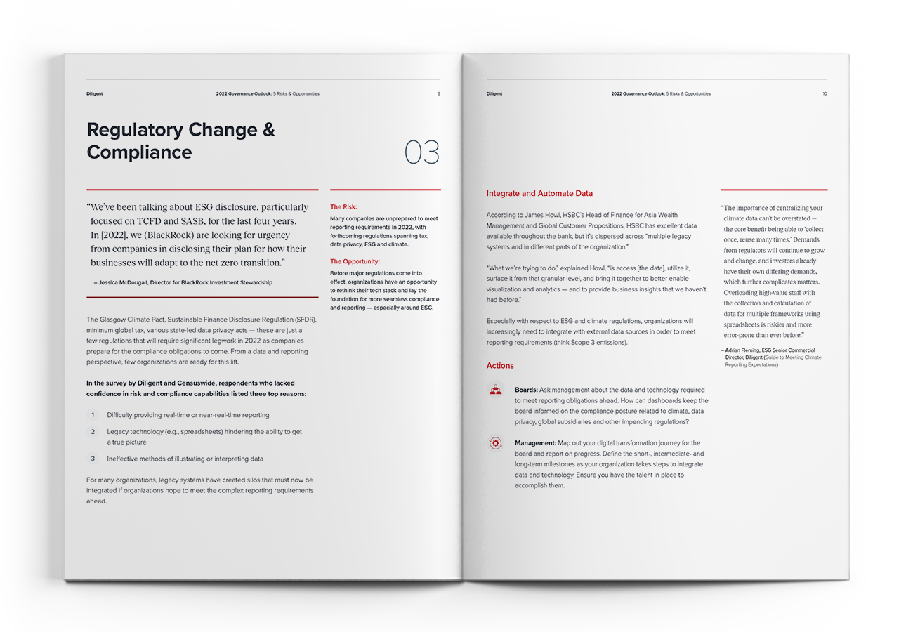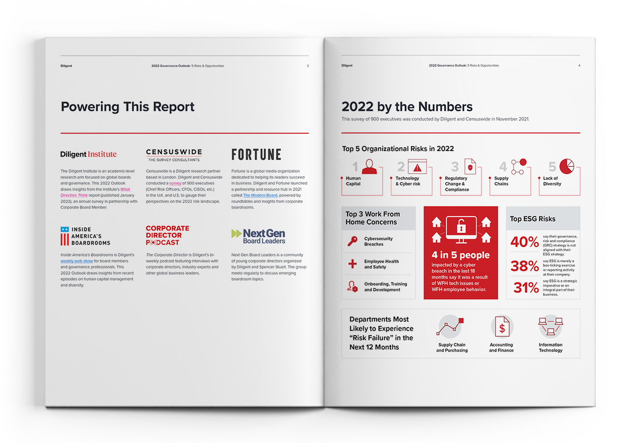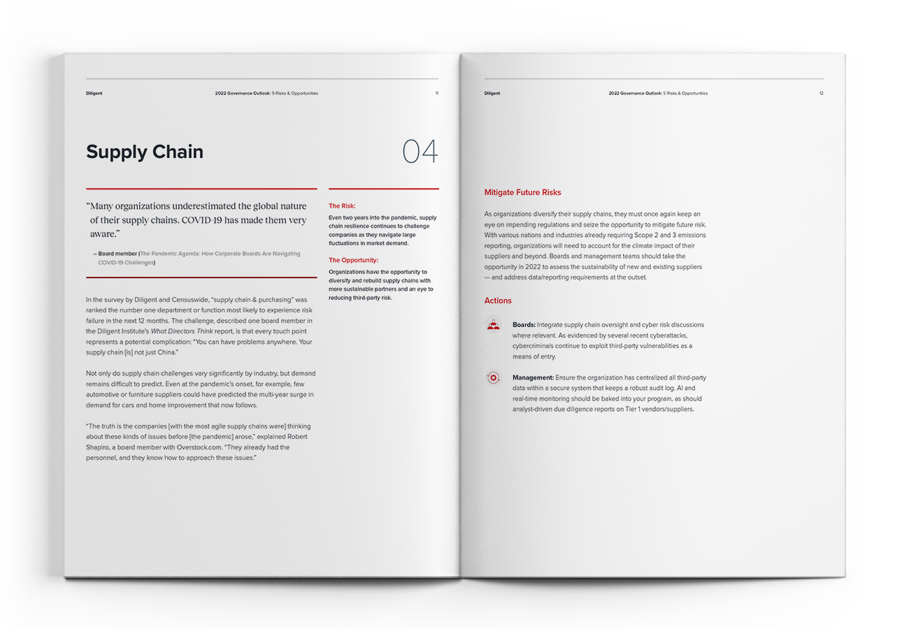 Diligent wanted a new look and feel for a monthly content series to help differentiate it from the their standard weekly white papers. The template had to be flexible enough to accommodate subject matter that would vary from month to month and the visual style had to translate across print and social media.